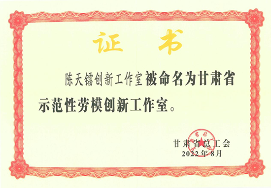 2022年8月,甘肅省總工會發(fā)布《關于命名第四批甘肅省示范性勞模創(chuàng)新工作室的決定》(甘總工法〔2022〕50號),命名蘭冶院陳天鐳創(chuàng)新工作室為“甘肅省示范性勞模創(chuàng)新工作室”。
