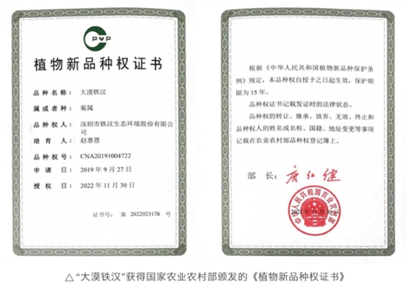近日,中節(jié)能鐵漢生態(tài)環(huán)境股份有限公司(前身為深圳市鐵漢生態(tài)環(huán)境股份有限公司)培育的菊屬植物“大漠鐵漢”獲得國家農(nóng)業(yè)農(nóng)村部頒發(fā)的植物新品種權(quán)證書。