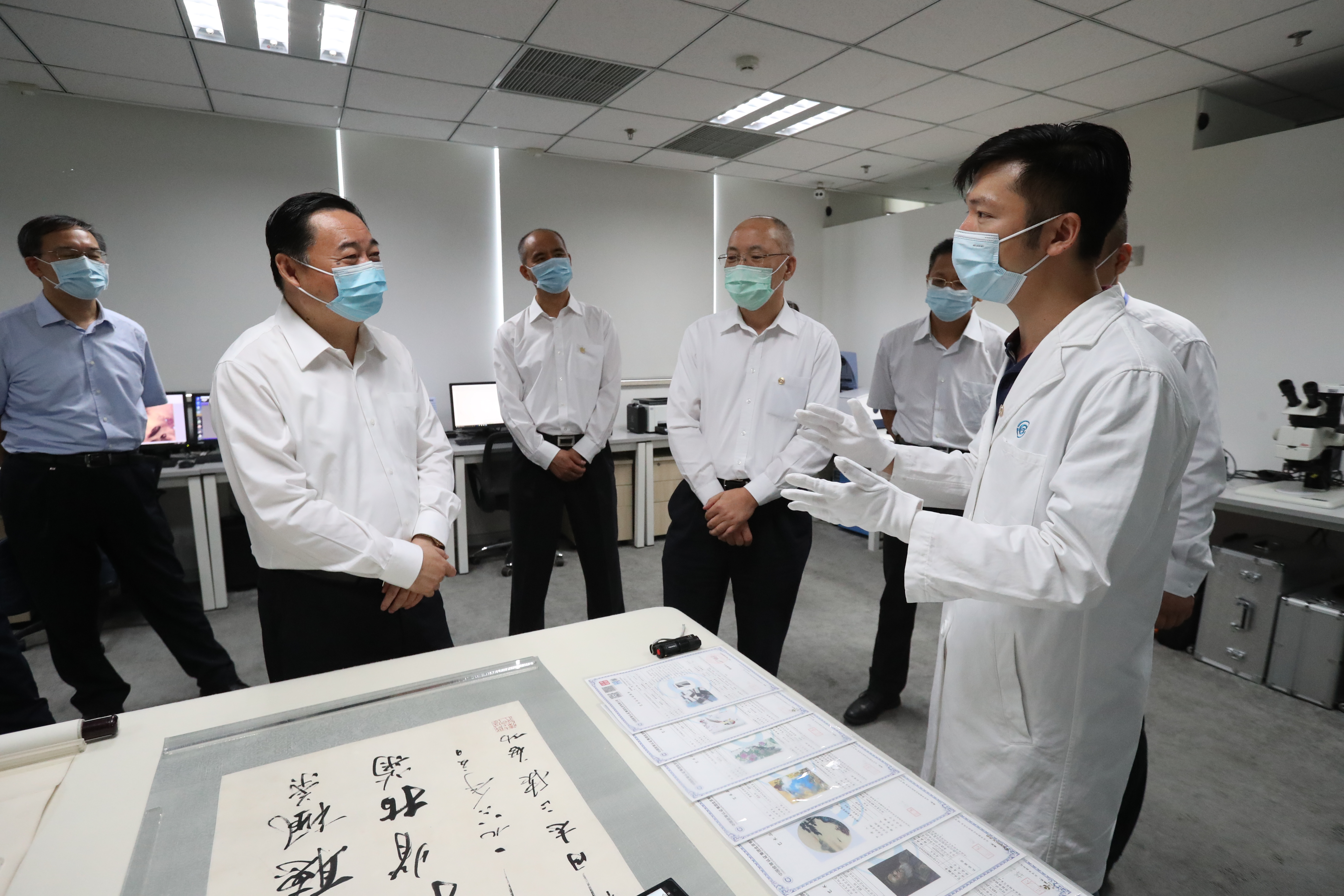 郝鵬走進中檢集團展廳,詳細了解企業(yè)改革發(fā)展歷程,隨后深入集團所屬北京公司鑒定實驗室和溯源技術(shù)服務(wù)有限公司,調(diào)研商品溯源等技術(shù)應(yīng)用及業(yè)務(wù)開展情況,圍繞企業(yè)深化改革、技術(shù)創(chuàng)新、疫情防控等與干部職工親切交流,對企業(yè)發(fā)揮專業(yè)優(yōu)勢,全力做好質(zhì)量檢測、物資通關(guān)等保障工作,助力新冠肺炎疫情防控給予充分肯定。郝鵬指出,中檢集團成立40年來始終將企業(yè)發(fā)展融入國家改革發(fā)展大局,通過改革創(chuàng)新、大膽探索,在檢驗檢測認證行業(yè)激烈的市場競爭中形成了較強發(fā)展優(yōu)勢,發(fā)揮了國家隊、領(lǐng)頭羊作用。去年底正式劃入國資委監(jiān)管以來,中檢集團廣大干部職工講政治、顧大局,勇于拼搏、無私奉獻,保持了企業(yè)平穩(wěn)運行,展現(xiàn)出良好的精神風(fēng)貌和工作作風(fēng),要牢記職責(zé)使命、主動擔(dān)當作為,在新起點上以更高標準推進各項工作再上新臺階。