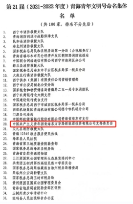 近日,第21屆(2021-2022年度)青海省青年文明號集體評選結(jié)果揭曉,共青團(tuán)青海東方華路新能源投資有限公司支部委員會被授予青海省青年文明號殊榮。