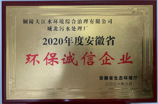 銅陵大江水環(huán)境綜合治理有限公司榮獲“安徽省環(huán)保誠信企業(yè)”稱號