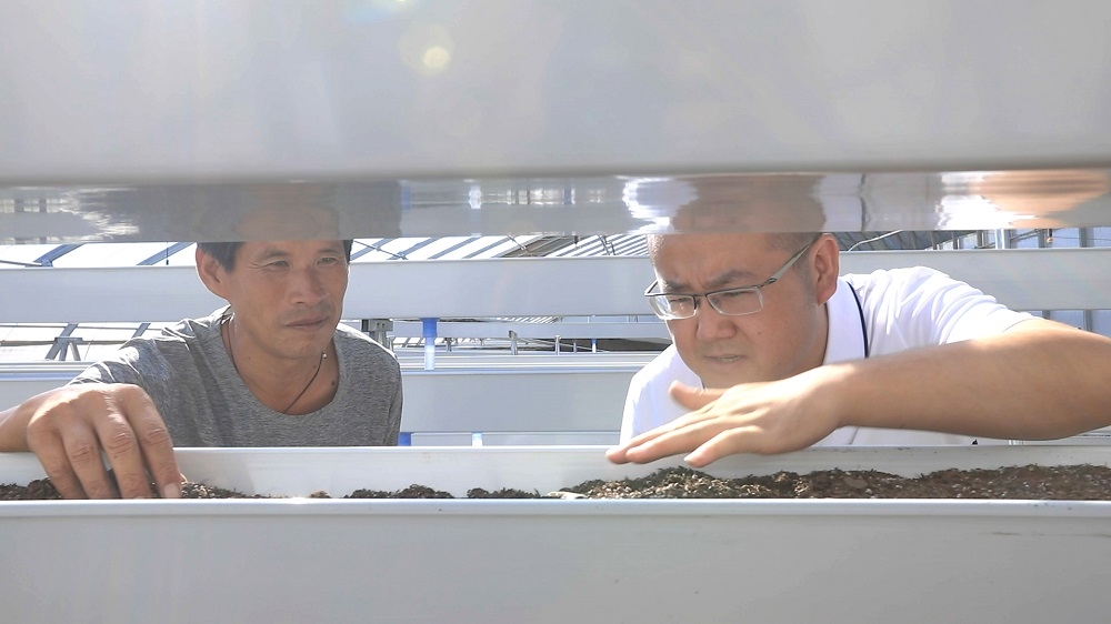 王文濤帶著村里致富能手,一起查看水果大棚果苗情況 |