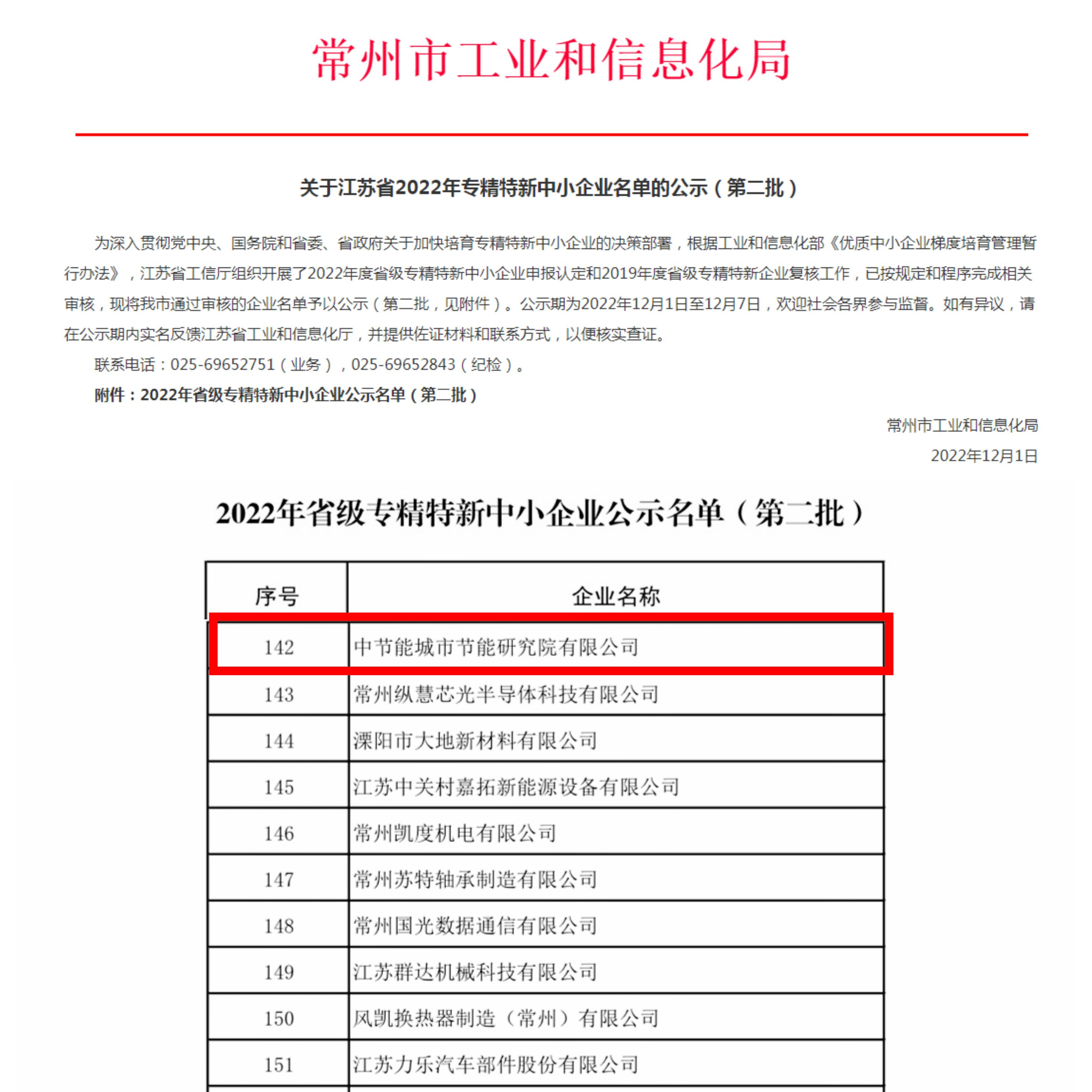 12月1日,江蘇省工信廳完成2022年度省級專精特新中小企業(yè)認定,中節(jié)能城市節(jié)能研究院有限公司成功入選“2022年江蘇省專精特新中小企業(yè)”。