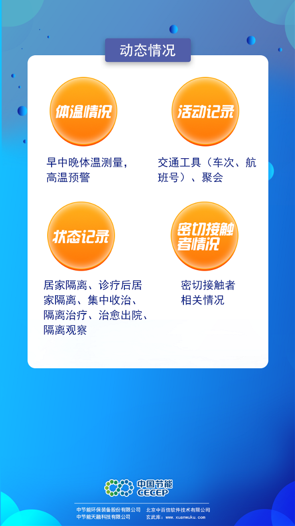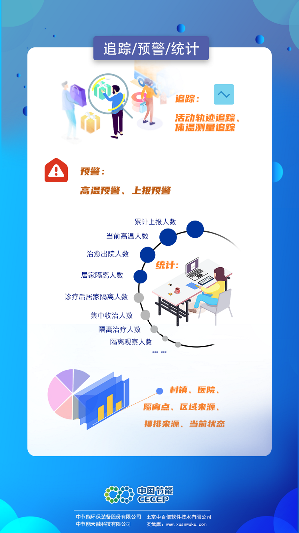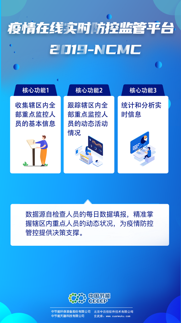新型冠狀病毒肺炎牽動著所有人的心,在這場“戰(zhàn)疫”之中,疫情防控是根本,追根溯源是關鍵。 日前,中國節(jié)能下屬專業(yè)裝備平臺公司中節(jié)能環(huán)保裝備股份有限公司推出“疫情在線實時防控監(jiān)管系統(tǒng)2019-NCMC”,可幫助各地快速精準掌握轄區(qū)內(nèi)重點人員基本情況和動態(tài)消息,為一線做出正確防疫決策提供數(shù)據(jù)支撐。中環(huán)裝備將無償提供該系統(tǒng)的專業(yè)技術支持和服務,為共同“戰(zhàn)疫”貢獻央企力量! 系統(tǒng)應用人工智能、大數(shù)據(jù)、云計算等多種技術,基于每日疫情防控基層單位的數(shù)據(jù)填報,可實現(xiàn)轄區(qū)內(nèi)重點監(jiān)控人員的信息收集、動態(tài)活動情況監(jiān)管和數(shù)據(jù)實時統(tǒng)計分析三大功能。