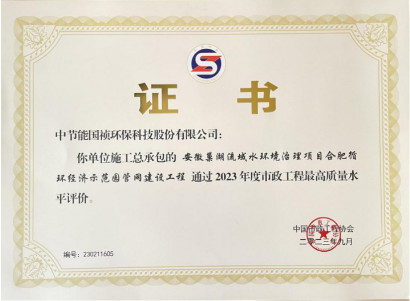 近日,由中節(jié)能國禎管網事業(yè)部作為施工總承包單位的“合肥循環(huán)經濟示范園管網建設工程項目”獲2023年度中國市政工程最高質量水平評價獎項。